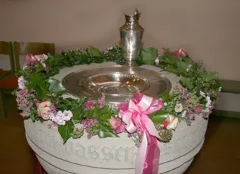 Festlich geschmückter Taufstein in der Dietrich Bonhoeffer Kirche zu Geinsheim